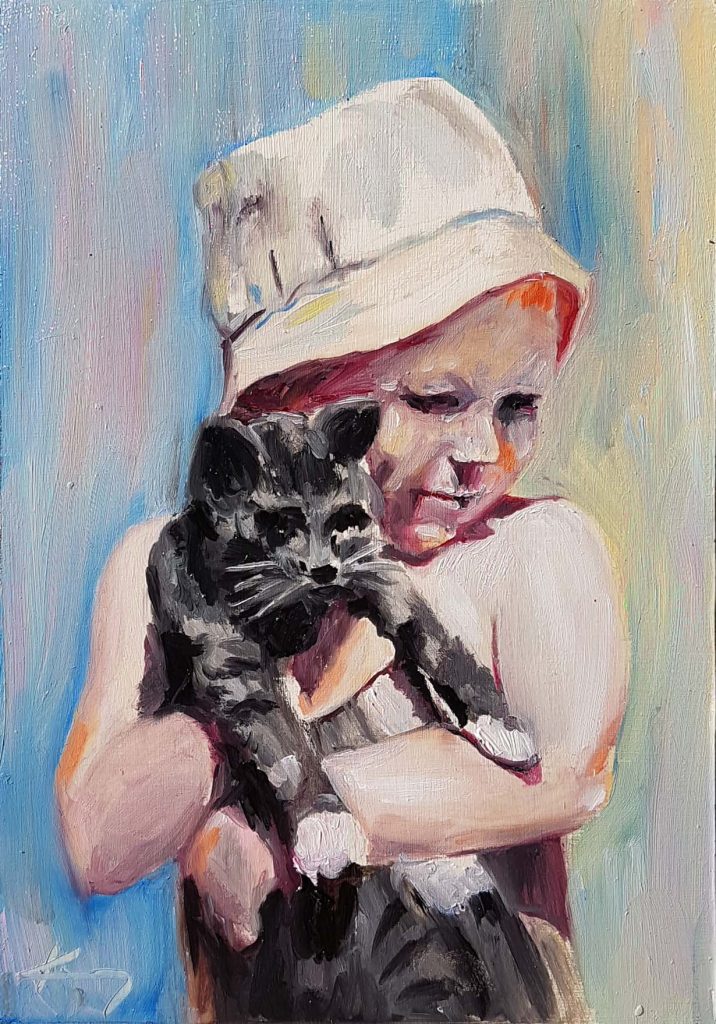 Tatiana Potapenko, also known as Artmoods TP, is a contemporary figurative art painter from Helsinki, Finland, who primarily works with portraiture using traditional media. Her inspiration for creating art comes from people, their narratives, and emotional experiences. She typically works in series, exploring a particular theme that resonates with her at a given moment through a number of paintings. Once she achieves internal reconciliation with that underlying theme or question, she moves on to the next one. In between series, she enjoys learning new techniques and materials by attending workshops and courses led by other fine art and contemporary artists.