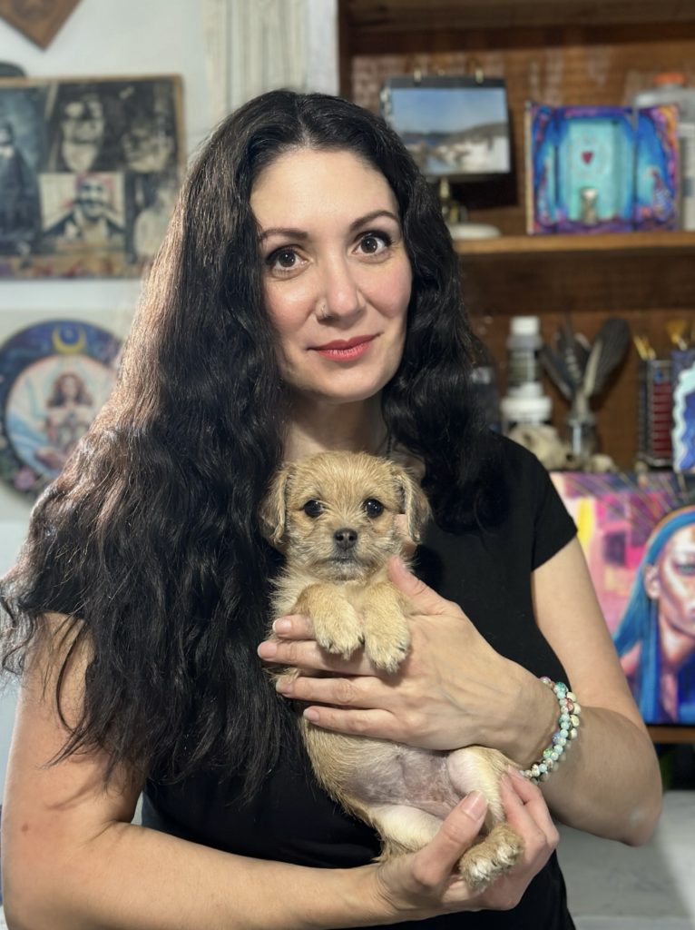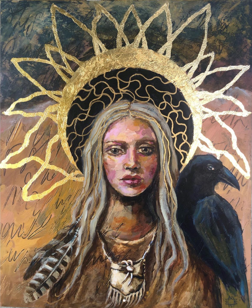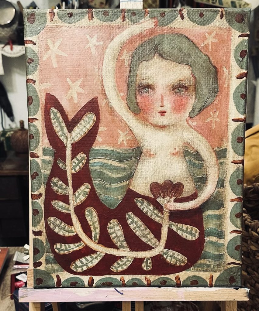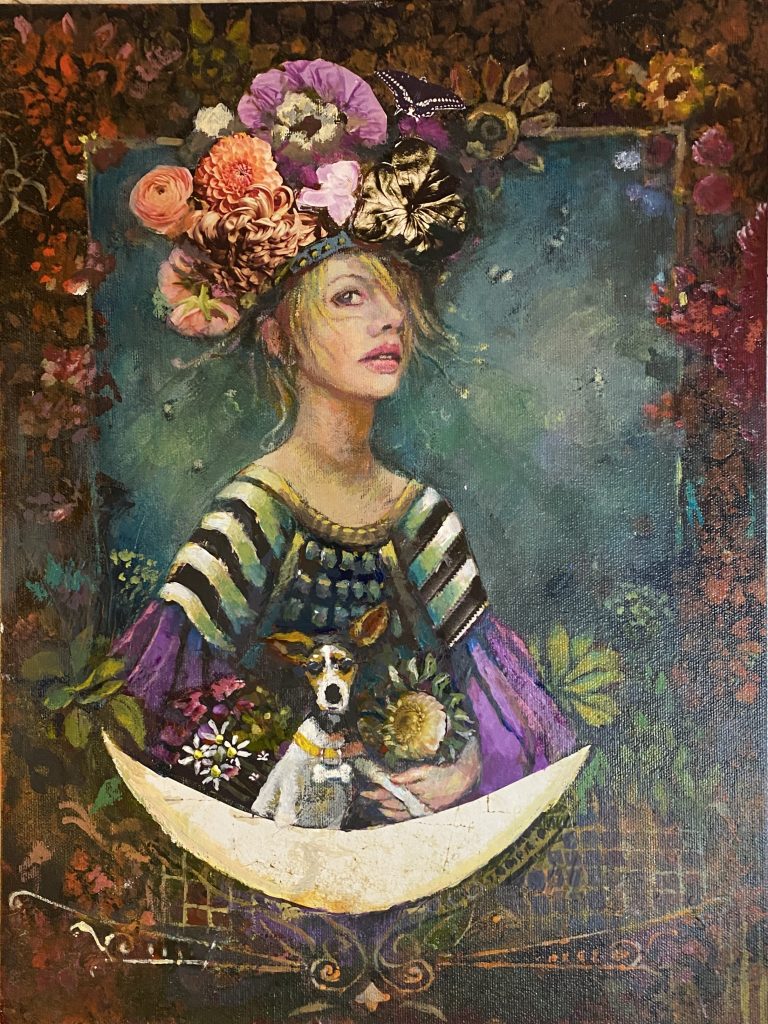 Some of the images I paint come to me in dreams fully realized. Others I really have just a small idea but trust the process and that my intuition will take over. I love trying new things and pushing the boundaries. I work mainly in acrylics as the dry time fits my crazy life. I love 3D mixed media as well and use fabrics and wood and clay to add to my painted works. If I can catch it I will paint on it so there’s really no limit to my canvas.