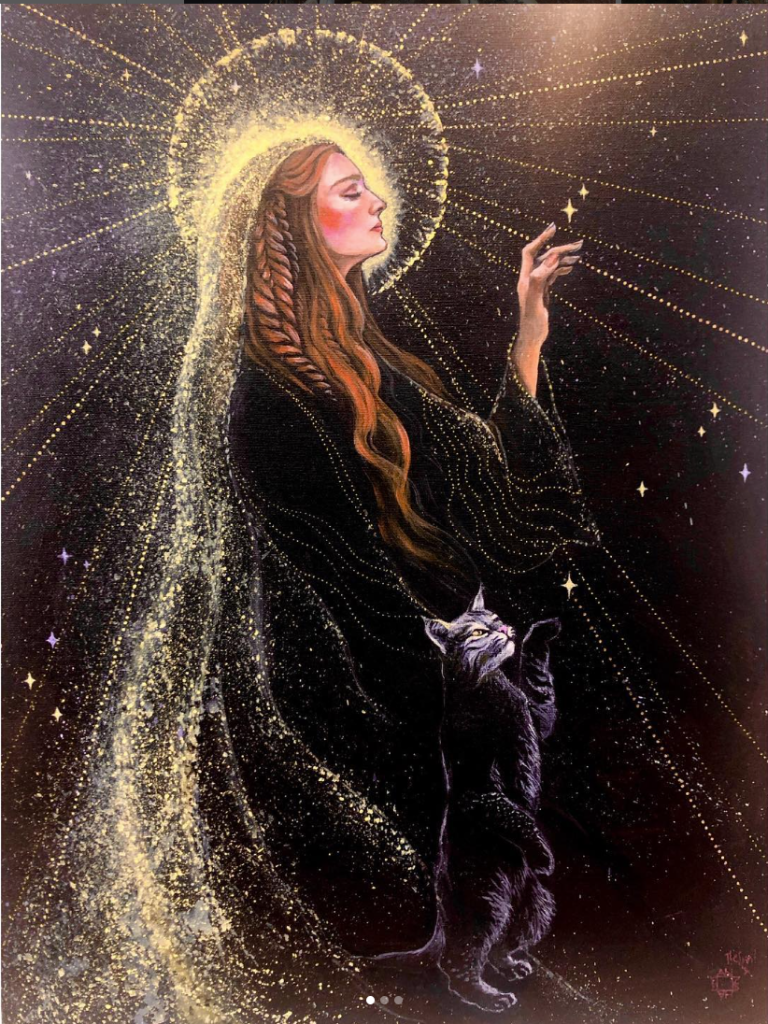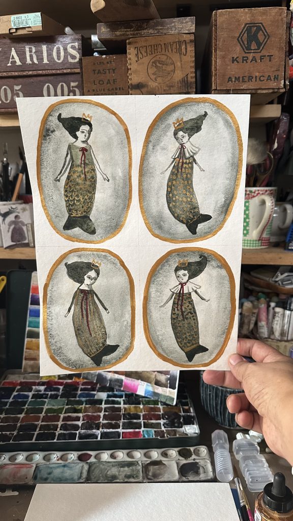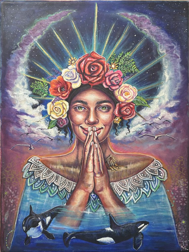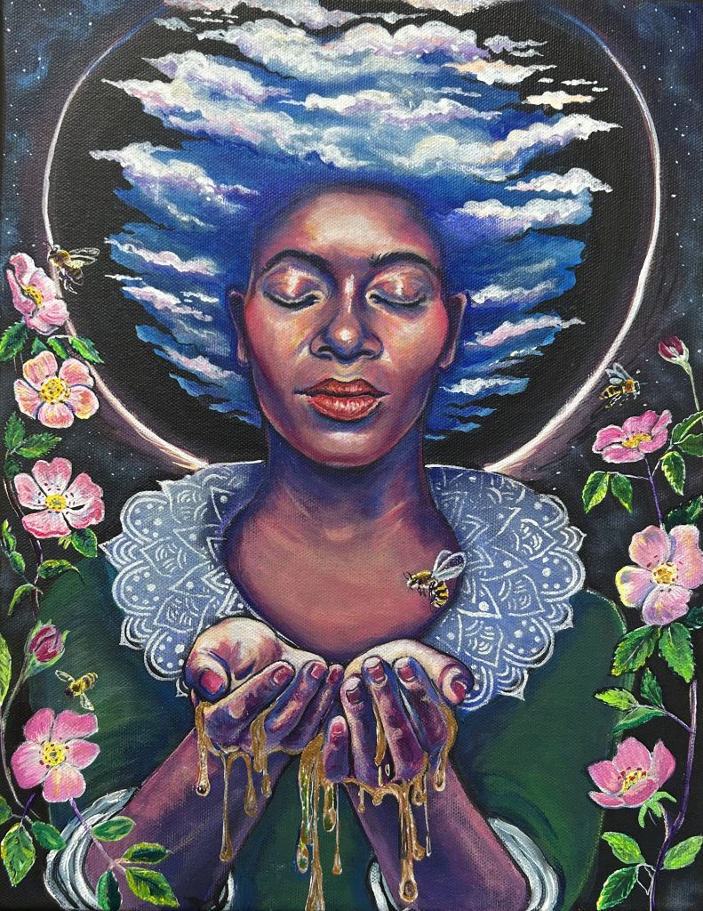 Some of the images I paint come to me in dreams fully realized. Others I really have just a small idea but trust the process and that my intuition will take over. I love trying new things and pushing the boundaries. I work mainly in acrylics as the dry time fits my crazy life. I love 3D mixed media as well and use fabrics and wood and clay to add to my painted works. If I can catch it I will paint on it so there’s really no limit to my canvas.