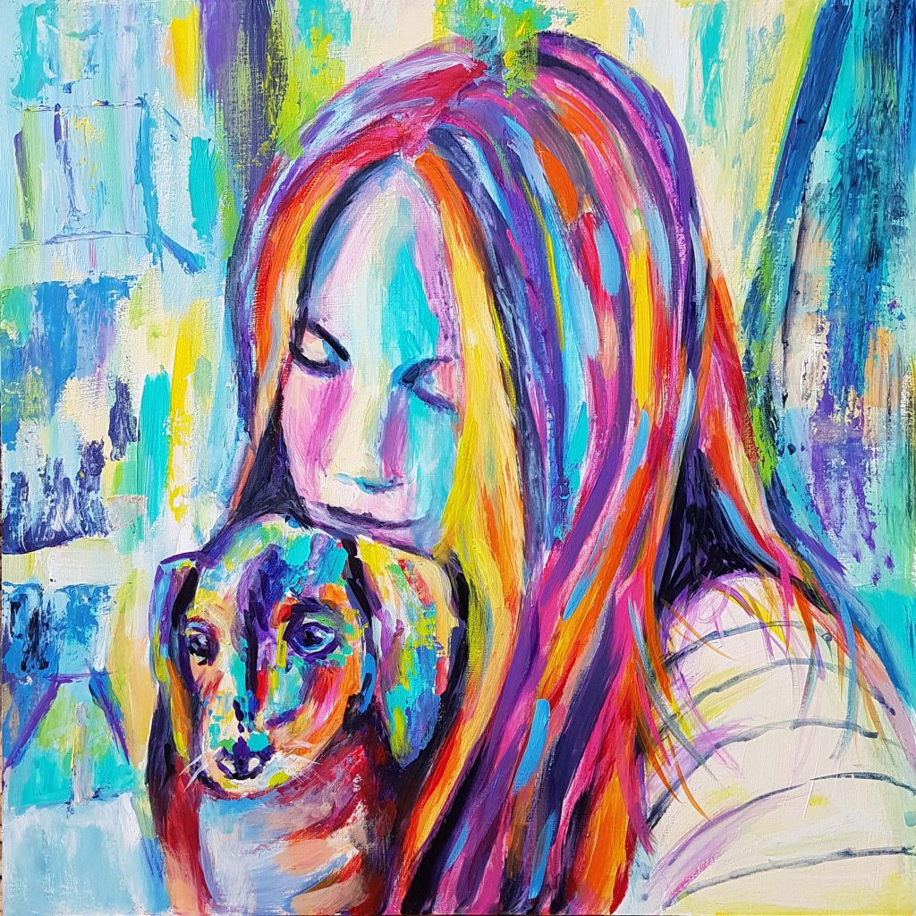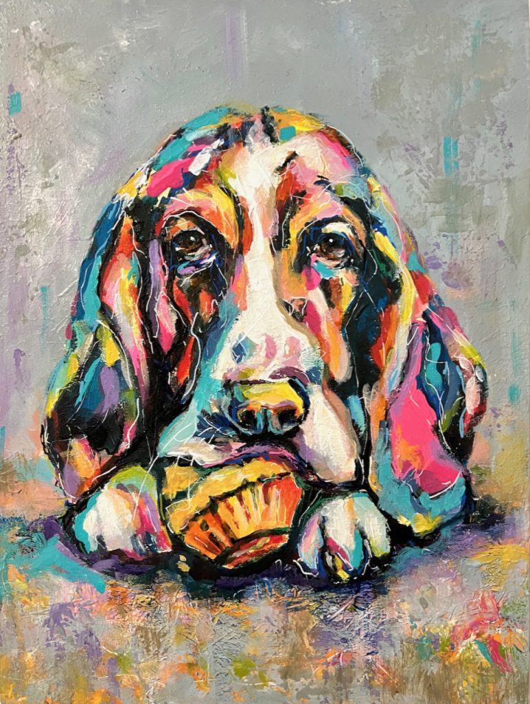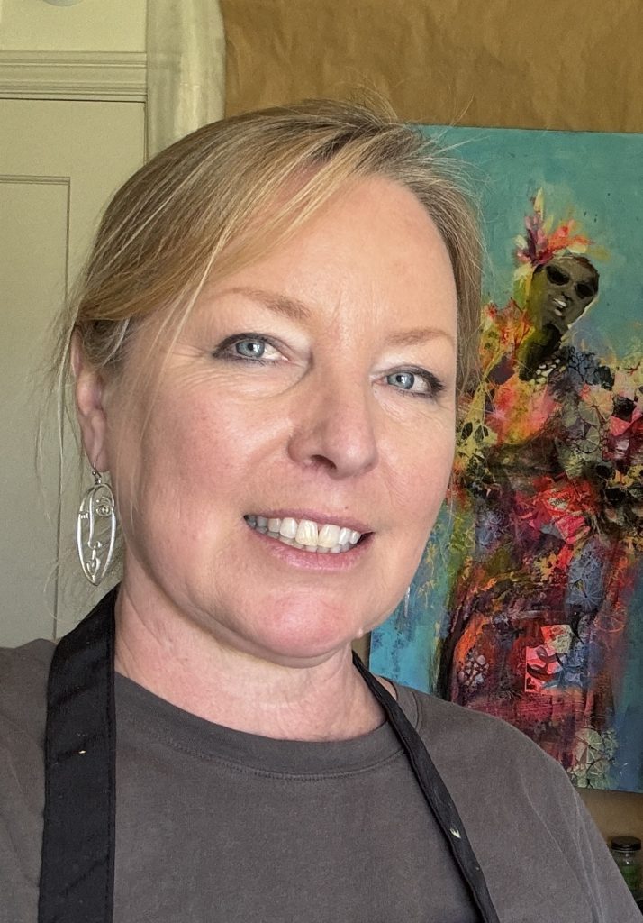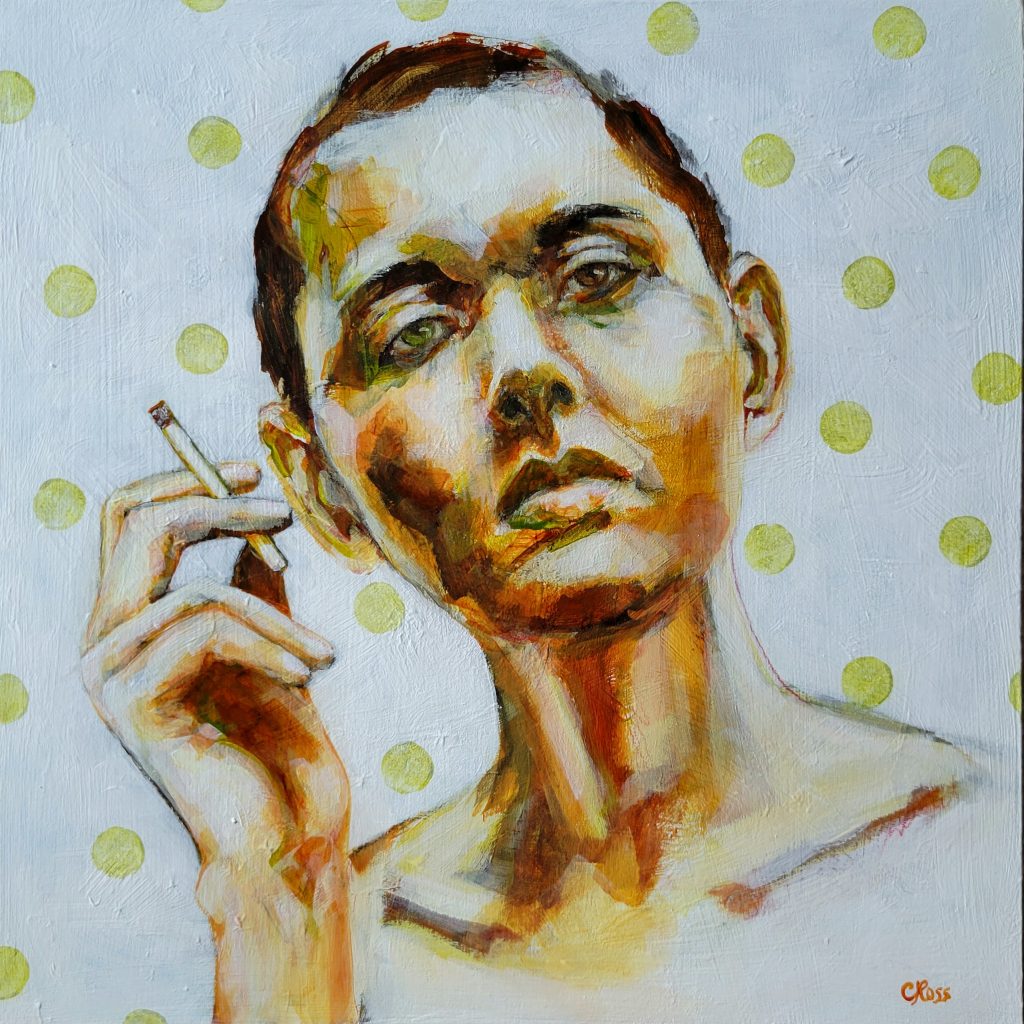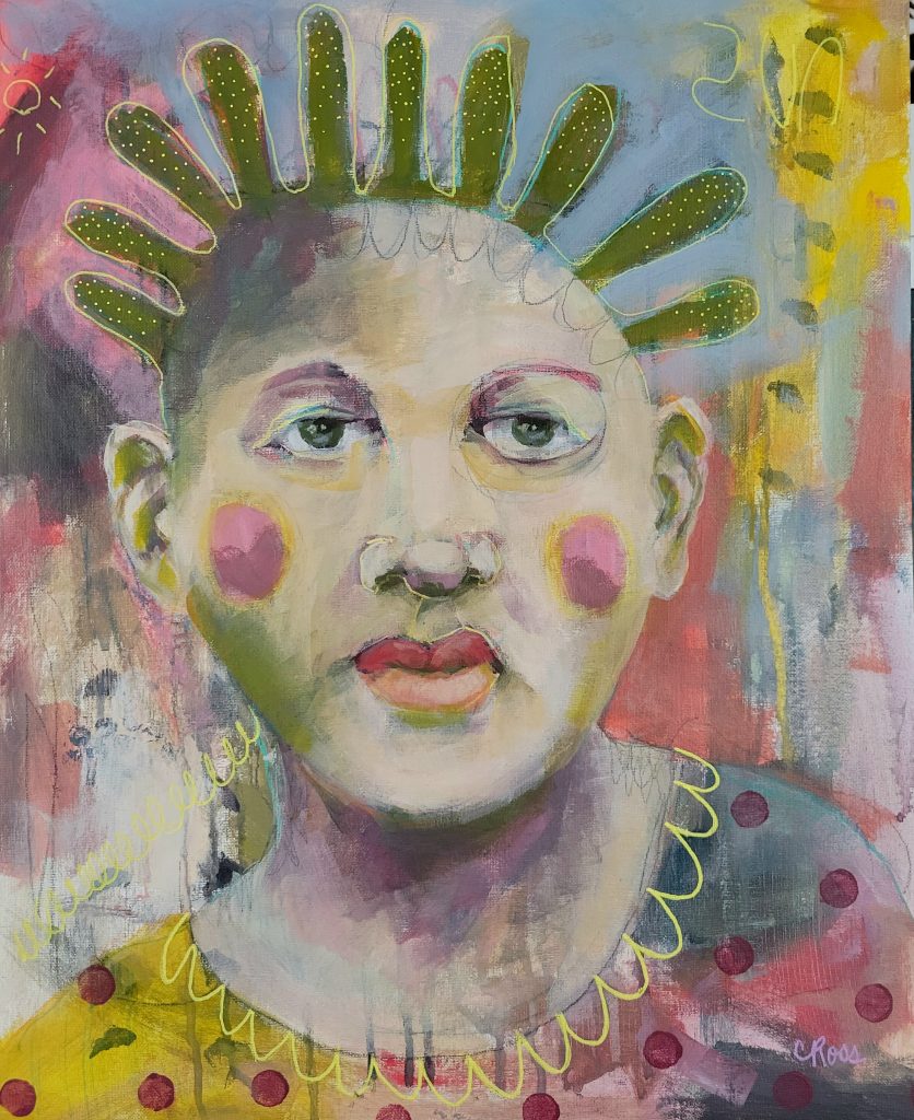 Cyndy Ross is a multi-faceted artist and native Oregonian. After 2-1/2 years working on a degree in graphic design, she left university and spent the next 25 years dipping her toes into everything artsy and craftsy while raising four children in the woods of the Pacific Northwest amongst a menagerie of animals. Colorful, expressive portraits have been her focused passion for the past 6 years. Lately she has been expanding her repertoire to include figures, often with animals. She loves instilling humor and quirkiness into her work. When she’s not painting, you can find her walking in the woods, knitting dishcloths, gardening, and reading.