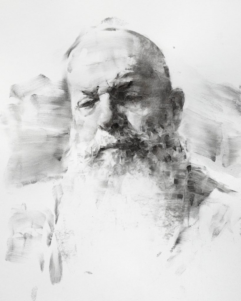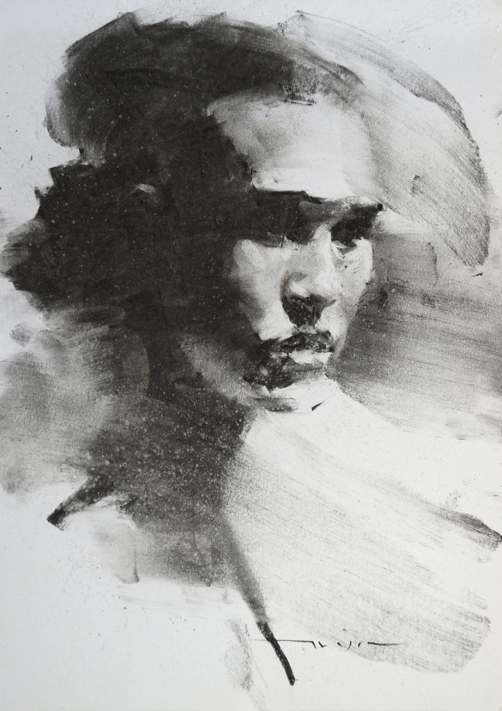 He mostly works in charcoal and oils. The specific look of his work, ranging from realism to abstract realism, is achieved through mixing drawing with painterly techniques.