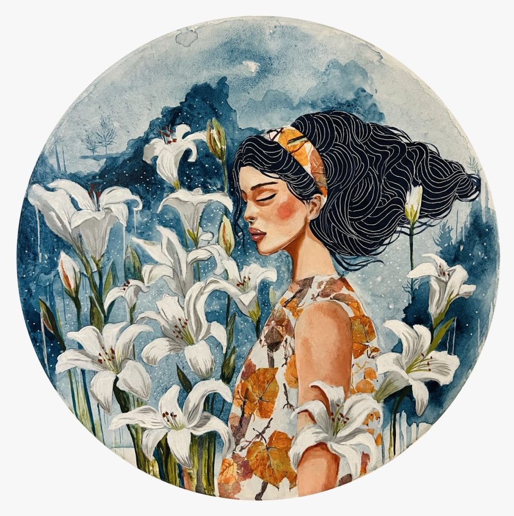 Lorena Iavorschi is a contemporary Romanian painter whose artistic journey begins somewhere in childhood when she receives a few tubes of oil paint without obtaining any instructions for use. She begins to paint on small pieces of unprepared canvas – often cut from her father’s shirts. Years later, she attends courses at some art schools, paints icons and face painting. Since 2005, she works as a mural painting restoration assistant. Old churches and hard but particularly beautiful work bring new artistic and moral values. Oil is by far the preferred medium, but she also experiments with other mediums such as acrylic, inks and the combinations between them. She discovers the beauty and versatility of gold leaf. Conquered by the decorative and graphic element, she is still looking for the balance between them and the pictorial image.